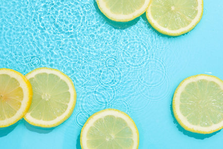 Lemon slices in clean transparent water over blue background with copy space. Water splashing on blue water surface in sunlight. Top view or flatlay. Summer, vacation, healthy eating concept. Banner