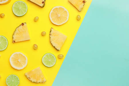 Slices of different fruits on color background