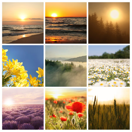 Picturesque nature. Collage with beautiful photos of flowers, sea and mountains