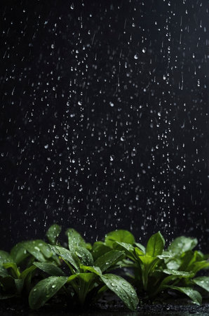 Raindrops cascade over vibrant green plants in a dark environment, creating a fresh and natural feel perfect for illustrations of growth, freshness and nature's beauty.