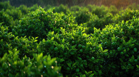 A panoramic wide view of Shiny bush field growing closely together under light drizzle soft raindrops on leaves ultra realistic photography natural daylight cinematic wide composition lifelike natural scene