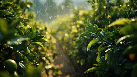 A panoramic wide view of Citrus tree field growing closely together in a dewy morning shining droplets on leaves warm soft daylight ultra realistic photography cinematic wide composition lifelike natural scene