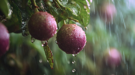 Soft rain falling gently on Passion fruit, with water droplets forming and slowly dripping. The background is softly blurred with a natural, moody atmosphere.