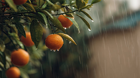 Soft rain falling gently on Orange tree, with water droplets forming and slowly dripping. The background is softly blurred with a natural, moody atmosphere.
