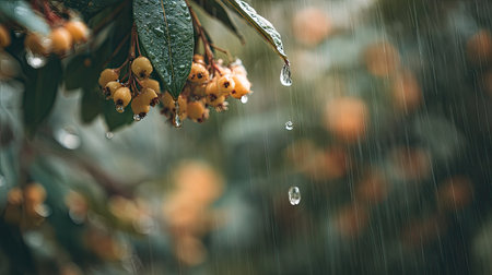 Soft rain falling gently on Loquat, with water droplets forming and slowly dripping. The background is softly blurred with a natural, moody atmosphere.