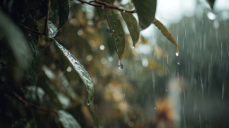 Soft rain falling gently on leaves, with water droplets forming and slowly dripping. The background is softly blurred with a natural, moody atmosphere.