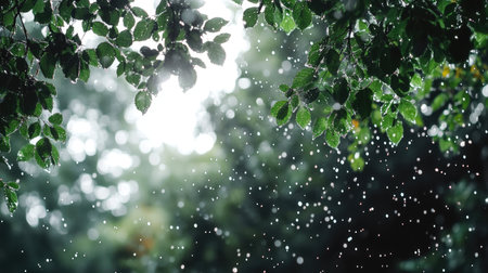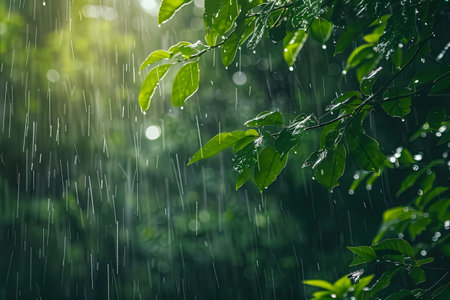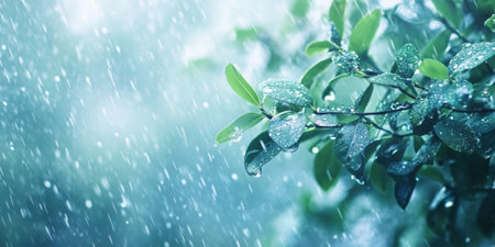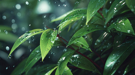 Lush green leaves are glistening with raindrops during a gentle rainfall creating a tranquil and natural scene that's perfect for illustrating nature or promoting relaxation.