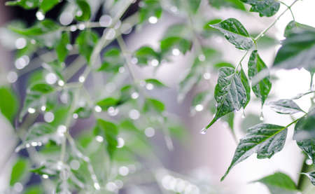 Summer raindrops fall in lines on green leaves