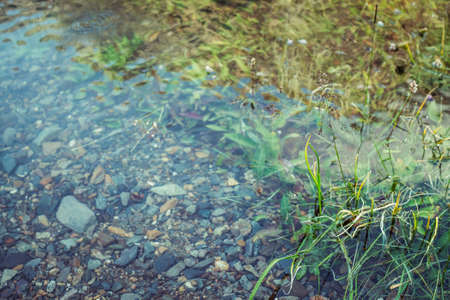 Small river with green grass and stones, close-up. Nature background