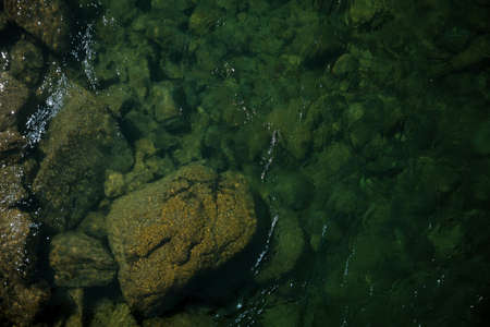 Nature background of green vegetation and stones in clear water. Underwater flora close-up. Natural texture of greenery on bottom of mountain lake after flood. Calm transparent water surface of lake.