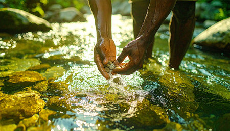 Hands gently holding river stones in crystal-clear water, symbolizing connection to pristine nature and outdoor exploration. Ai-Generated.
