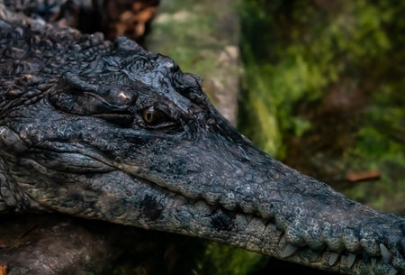 Close-up of the jaw of a huge crocodile lying in the jungle at the zoo. Large white sharp teeth stick out of its mouth. A dangerous animal. A carnivorous hunter lurking in anticipation of its prey.
