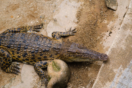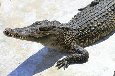 Crocodile basking in the sun, on a concrete surface, top view, close-up, crocodile farm, crocodile farming.