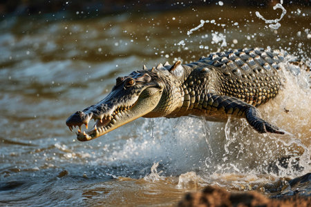 A crocodile launching itself from the water to catch prey