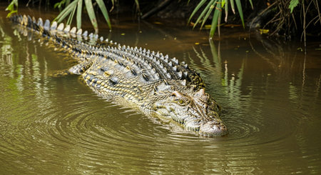AI Generated. In the murky waters of the Everglades, a formidable crocodile lurks, its sinister gaze fixed on its surroundings with razor-sharp focus