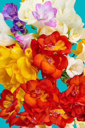 Bouquet of multi-colored freesias on a blue background. Beautiful flowers.