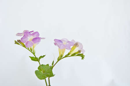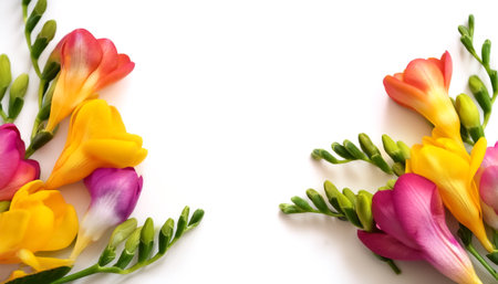 Freesia flowers bright colors with leaves pattern on side position provides copy space for text. background concept isolated white