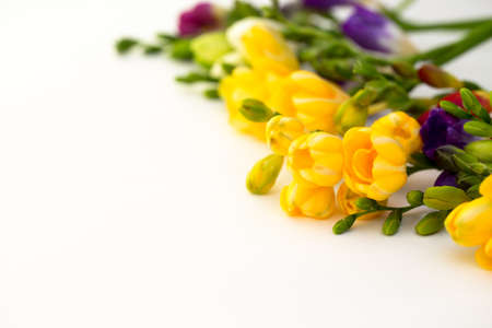Spring background. Beautiful spring freesia flowers on a white background. Place for text, close-up.