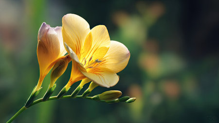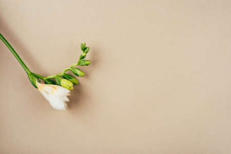 Floral background. One freesia flower on a beige background. Minimal concept. Flat lay, top view. Copy space for text.