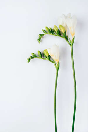 Minimalistic style flat lay of freesia flowers on white background. top view