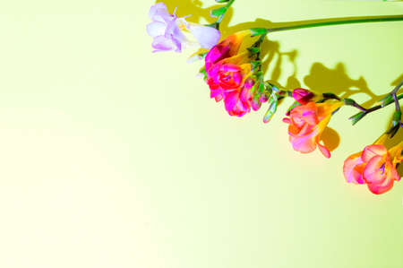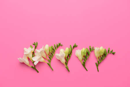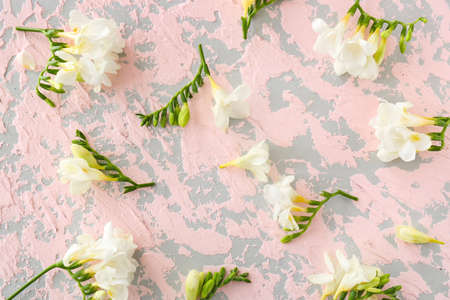 Bunch of fresh blooming freesia flowers on color background. Top view.