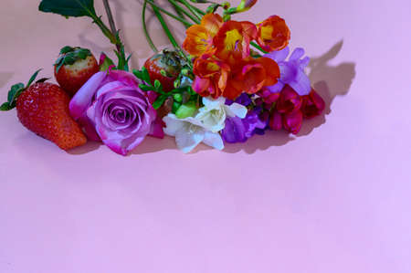 Multicolored freesia flowers on a pink background. Festive beautiful background. Flat lay, flower pattern