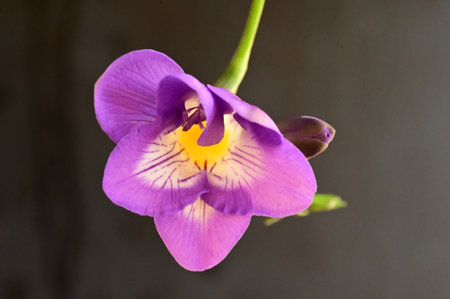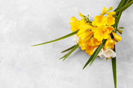 Posy of fresh freesia flowers close up on gray stone background with copy space