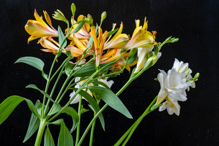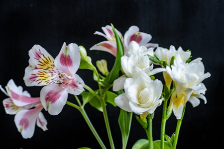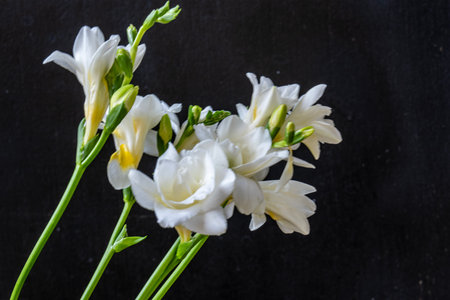 Beautiful freesia with fragrant flowers on dark background, closeup