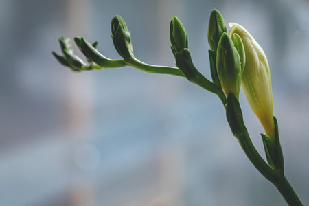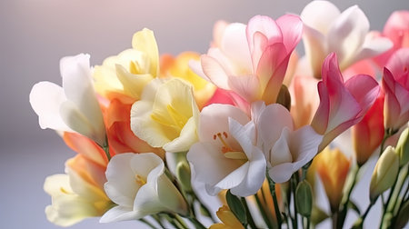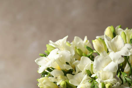 Beautiful freesia with fragrant flowers on gray background. Space for text