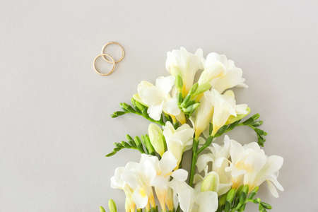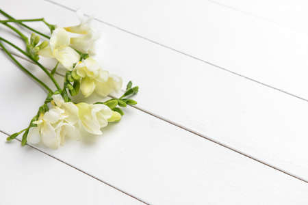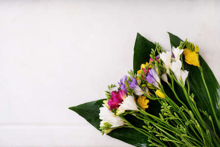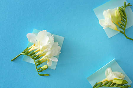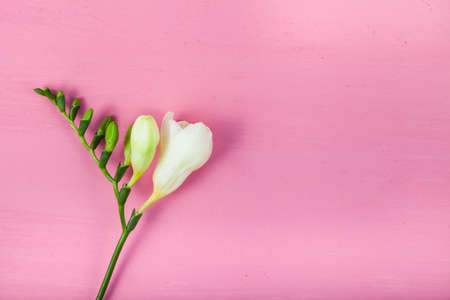 Floral background. Freesia flowers on a white background. Minimal concept. Flat lay, top view. Copy space for text.