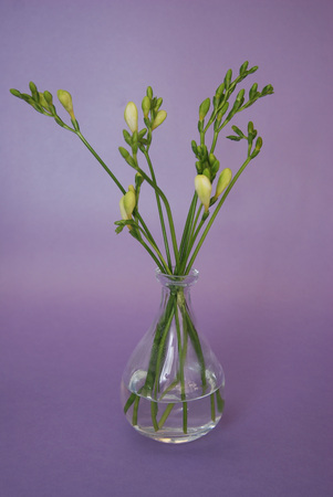 Fresh Freesia Green buds in Glass Vase isolated on Pink Rose background.