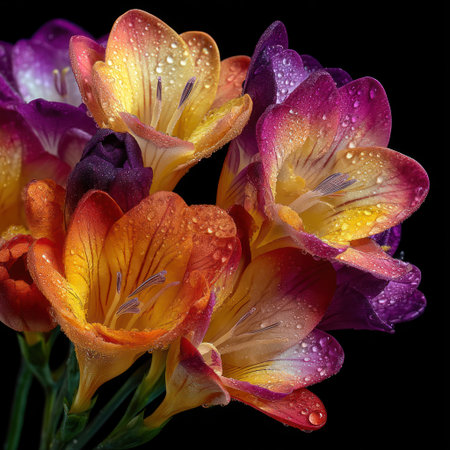 A close-up captures a bouquet of freesia flowers with a spectrum of colors, including yellow, orange, and purple hues. The flowers display a natural texture with water droplets, creating a visual contrast against the black background. Ideal for botanical illustrations, floral designs, and various commercial projects.