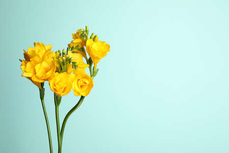 Beautiful blooming yellow freesias on light blue background. Space for text