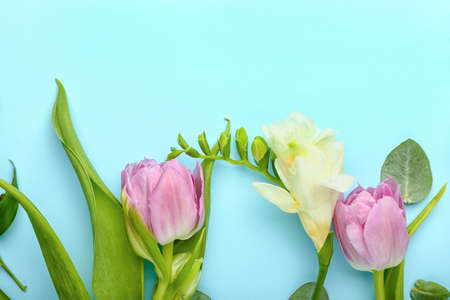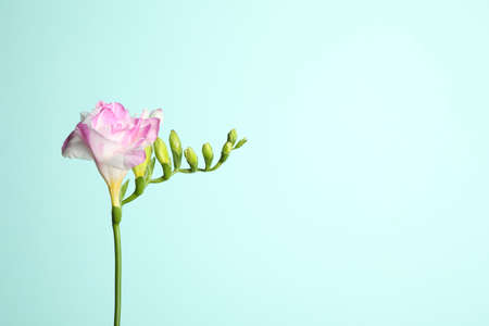Beautiful freesia flowers on color background, flat lay. Space for text