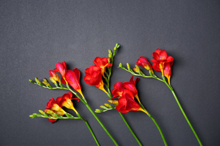 Beautiful freesia with fragrant flowers on dark background, top view. Space for text