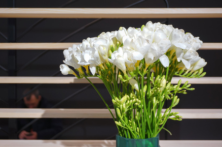 Freesia white flowers in glass vases on white background. Selective focus, copy space.