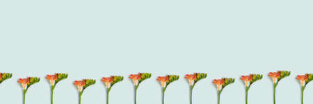 Banner with freesia flowers frame on a blue pastel background. Floral concept with copy space.