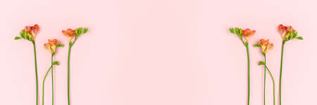 Banner with freesia flowers on a pink pastel background. Floral composition with place for text.