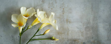 A freesia with a concrete backdrop and an empty wall. The delicate yellow petals and slender stems add a touch of elegance to the stark, gray background.