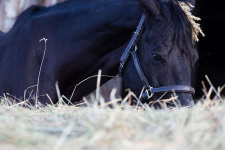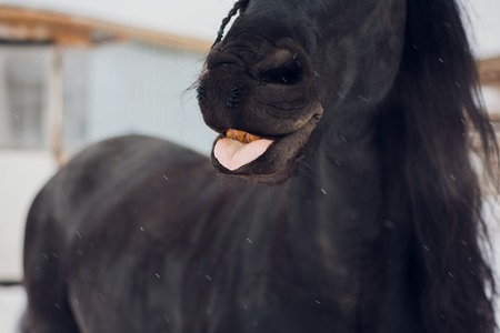 Beautiful black horse portrait on a dark background. Animal portrait.