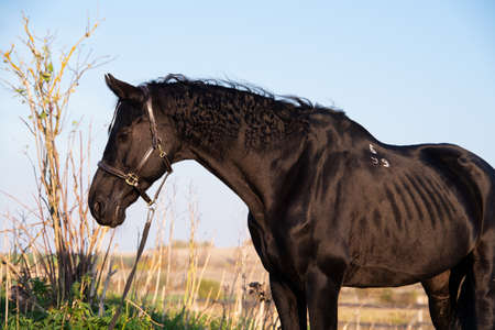 horse at sunset. beautiful Black frieze on the field in the sun.