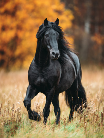 Black horse strides confidently through a field of golden grass, surrounded by vibrant autumn leaves reflecting warm sunlight.