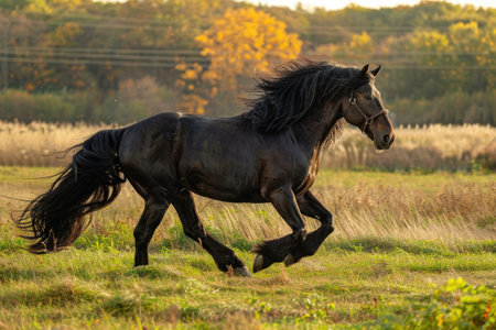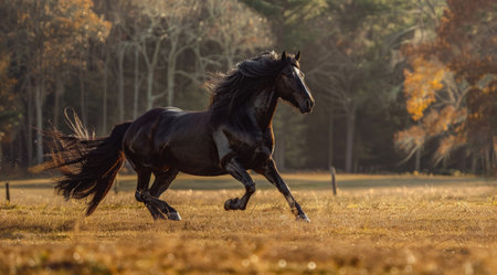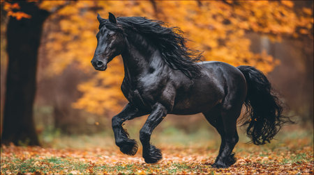A stunning black horse is shown mid-gallop in a forest setting. The image displays rich colors of autumn with golden foliage and a soft, diffused lighting. The composition highlights the horse's flowing mane and tail. This photograph is ideal for commercial and editorial purposes.