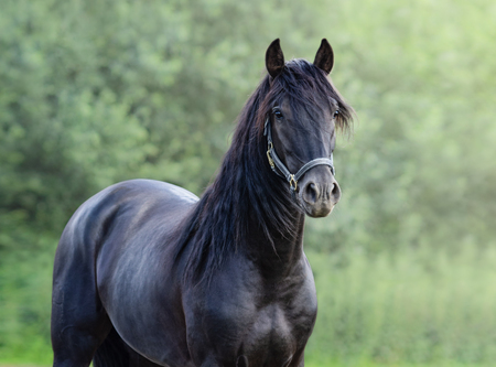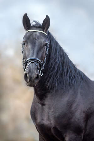 Black Friesian horse portrait, looking forward with long mane against autumn background