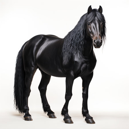 A magnificent black stallion galloping proudly, its long mane and sorrel liver flowing gracefully in the wind. White isolated