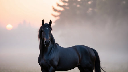 A majestic black Friesian horse stands proudly in a misty mountain valley at dawn.