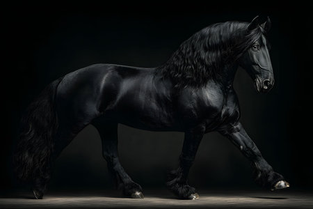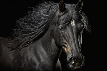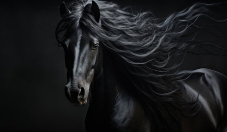 A striking image of a black friesian horse showcasing its powerful build and flowing mane against a dark backdrop. the scene highlights the elegance and strength of the horse, emphasizing its regal and graceful presence. Generative AI