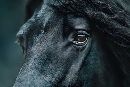 A striking close-up portrait of a black horse, its eye and flowing mane. the image majestic elegance of the equine subject, offering a detailed, soulful expression perfect for equine-themed decor or art. Generative AI