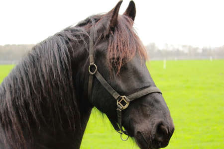 Friesian horse head profile. The horses mane extends from the top of the head to the end of the neck. Close up shot. High quality photo