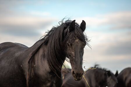 A black stallion in the wild. Thoroughbred black horse in the wild.
